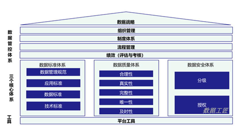 本文重点从数据战略、数据管控(组织管理、制度体系、流程管理及绩效)、三个核心体系(数据标准体系、数据质量体系、数据安全体系)和工具等重点介绍。
