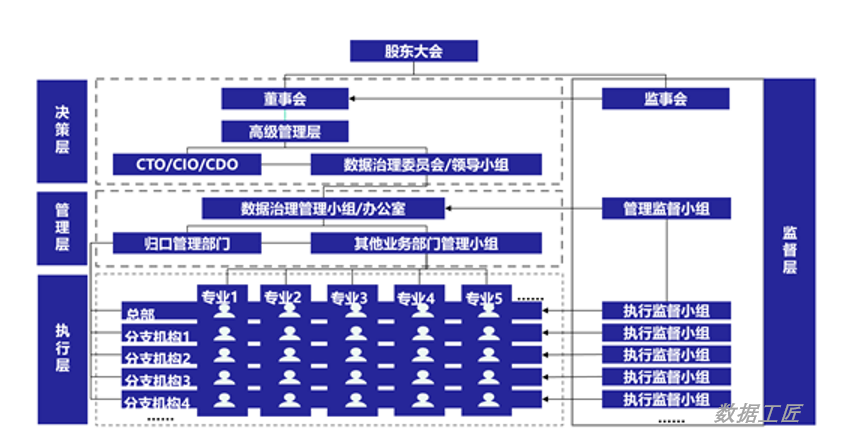 建立合适的数据治理组织是企业数据治理的关键。数据治理的组织建设一般包括组织架构设计、部门职责、人员编制、岗位职责及能力要求、绩效管理等内容。数据治理是一项需要企业通力协作的工作,而有效的组织架构是企业数据治理能够成功的有力保障。为达到数据战略目标,非常有必要建立体系化的组织架构,明确职责分工。