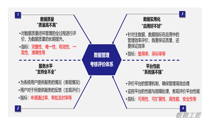 要使数据治理的体系运转好,必须要有好的激励体系。数据绩效管理包括数据管理指标、数据认责机制、数据考核标准、数据管理的奖惩机制,以及绩效管理过程的一系列活动集合。