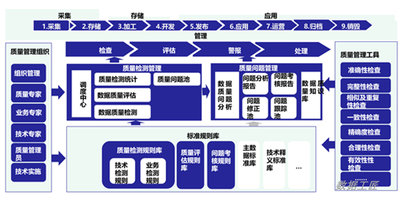 数据质量管理贯穿数据生命周期的全过程,除了明确数据质量管理的策略,还要善于使用数据质量管理的手段及工具,覆盖数据质量需求、数据探查、数据诊断、质量评估、数据监控、数据清洗、质量提升等方面。