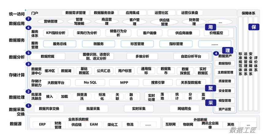 面向数据全生命周期,提供的一站式数据规划、集成、开发、治理、服务、应用等产品。数据平台能力框架:5个维度(采、聚、理、用、保),7个功能层次。