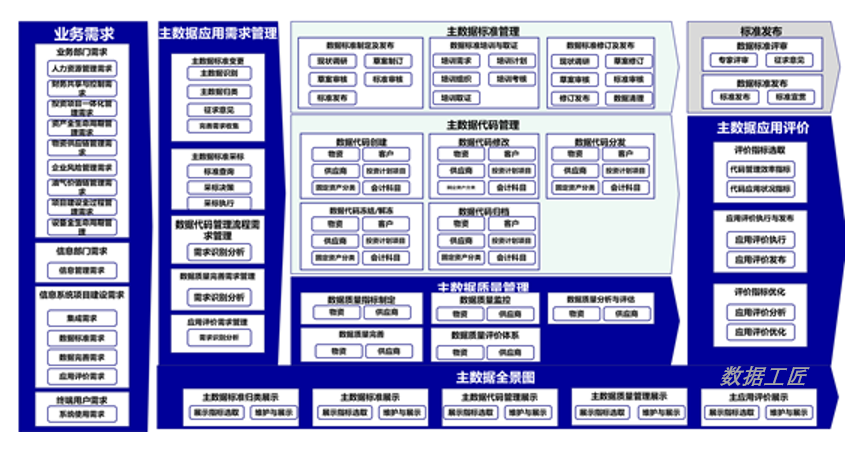 主数据服务业务视图包括8个业务域、32个业务子域及相关业务活动,主数据管理工具是主数据全生命周期管理的平台,也是主数据标准、运维体系落地的重要保障。本章从主数据标准管理、主数据代码管理、主数据清洗校验、主数据生命周期管理、主数据质量管理、主数据应用评价、主数据全景图,主数据应用需求管理、业务需求等。