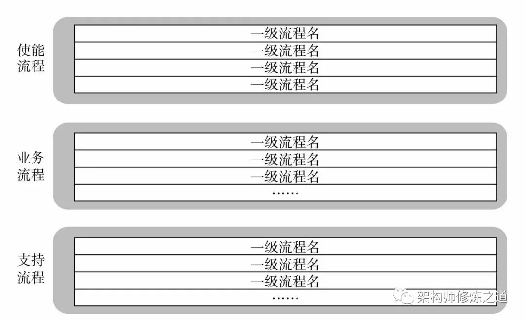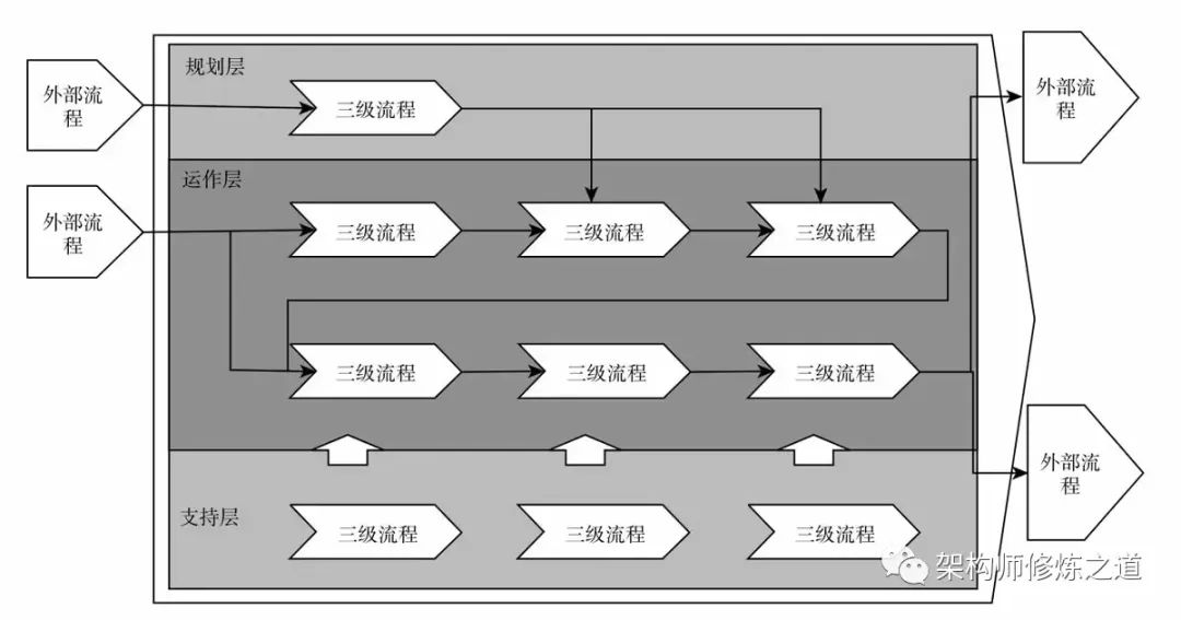 流程架构规划本质是管理建模的过程,将管理思想、思路模型化,为流程体系建设提供一个稳定、可持续积累的架构。(1)流程架构完整和职责明确不重复,同一层级流程之间不重叠、不交叉(2)流程架构规划遵循高阶共享(一二级)、低层差异(三四五六级)的原则(3)每一个一级流程架构规划遵循:规划、运作、支撑三层次设计原则。