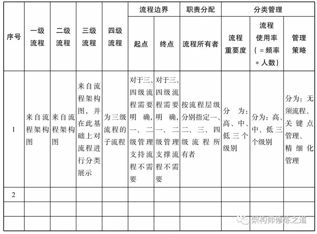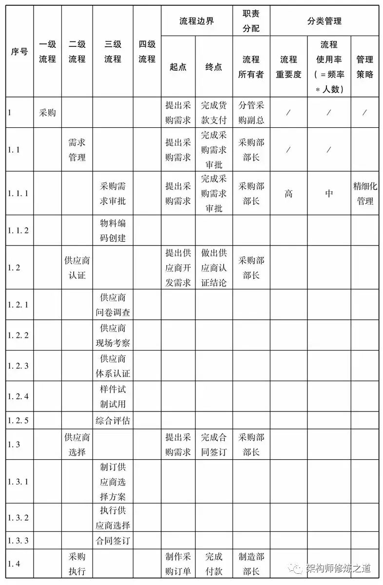 (1)一、二、三级流程必须保持与流程架构图一致,然后根据不同业务场景将三级流程进行分类,形成差异化的三级流程以匹配不同业务类型或模式,复杂的三级流程进一步细化,形成四级流程清单。四级流程应当成为流程规划最细的层级,不能五级了。