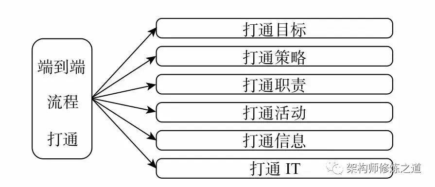 (1)企业可以做一个简单的分析,一线作战人员有多少时间花在了战斗中,有多少时间花在满足后台部门的管控要求?(2)端到端流程打通的维度:通常包括从目标、策略、职责、活动、信息(信息传递)及IT六个维度的打通。
