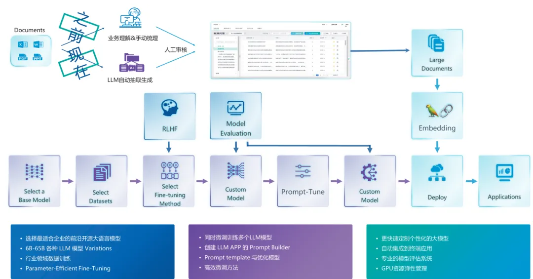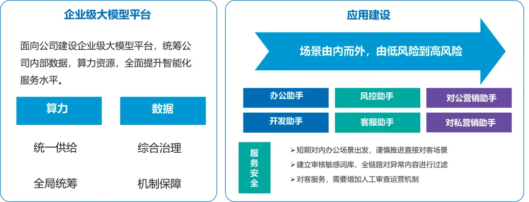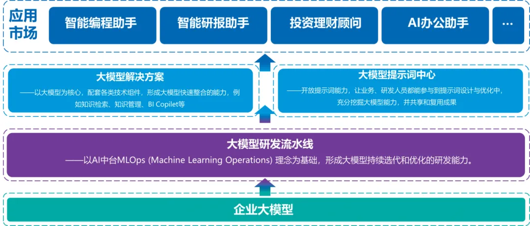Embedding模式、Copilot模式和Agents模式代表了大模型在企业中逐步深入的三种方式。公司通过建设企业级大模型平台(如图1),整合内部数据和算力资源,全面提升数字化服务水平。这些模式在证券行业中的应用,对于提升金融服务质量和效率起着重要作用。