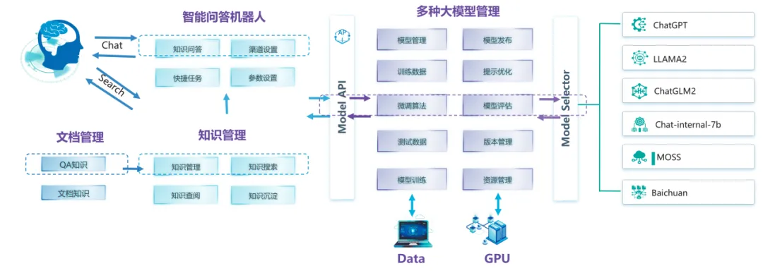 因此,专用领域知识管理大模型(如图2)比训练垂直领域大模型更适合证券公司。通过文档管理模块管理非结构化文档,应对证券公司中业务文档版本变化频繁的问题。提供统一的搜索,帮助用户更精准、更高效、更便捷地获取知识信息。通过大模型管理接入并管理多种不同参数量的大模型,为企业构建低成本、高效、数据安全、模型安全及自主可控的AI底座。通过大模型兼容过去的智能问答机器人为企业提供大模型知识问答能力,获取方式更直接,建立公司级、部门级、个人级文档对话管理系统。
