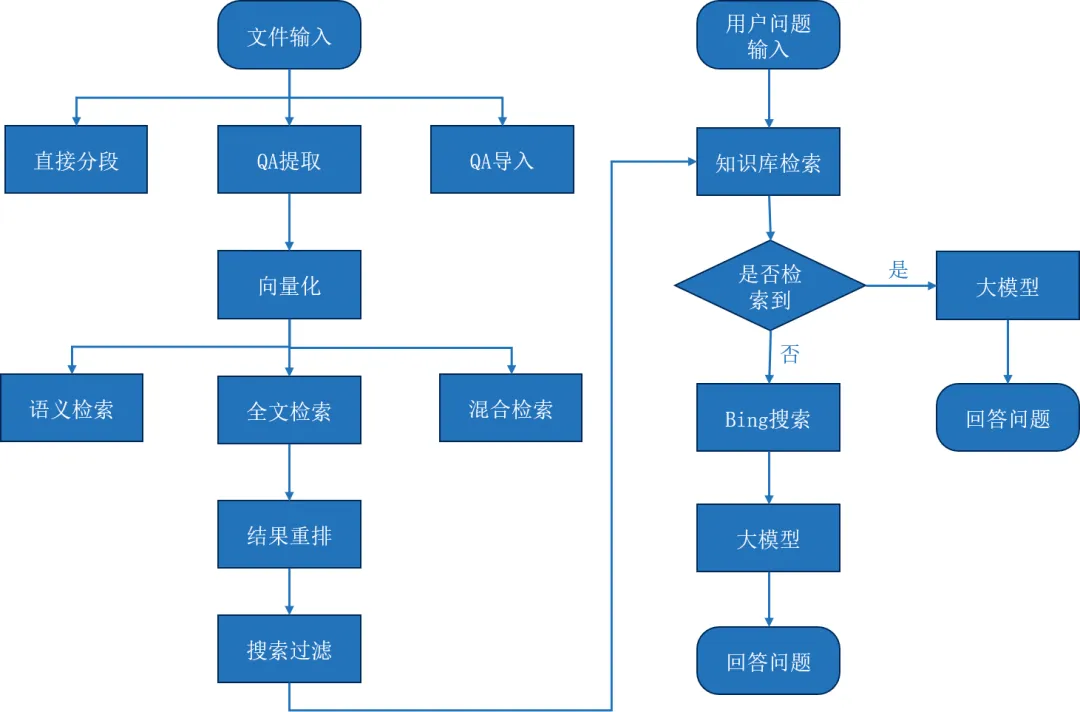 文档问答助手的系统流程图(如图5),通过构建不同的数据库为不同的AI助手提供支持,文档支持三种方式:上传QA问答的CSV;上传文档由大模型自动抽成问答对;上传文档,直接通过文档来进行问答。通过向量检索、语义检索、混合检索三种方式进行数据检索,由于混合检索后的查找范围很大,并且无法直接进行相似度过滤,通常需要进行利用重排模型进行一次结果重新排序,并利用重排的得分进行过滤。这种多种检索方式混合检索,可以有效提高搜索结果的准确率。