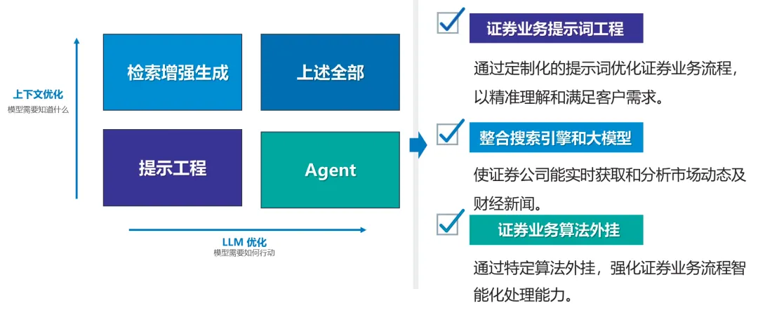 证券大模型优化方法主要有以下几种方式:证券业务提示词工程,通过定制化的提示词优化证券业务流程,以精准理解和满足客户需求;整合搜索引擎和大模型,使得证券公司能实时获取和分析市场动态及财经新闻;证券业务算法外挂,通过特定算法外挂,强化证券业务流程智能化处理能力。通过这些方式可以更高效、灵活地适应金融市场的快速变化(如图7)。