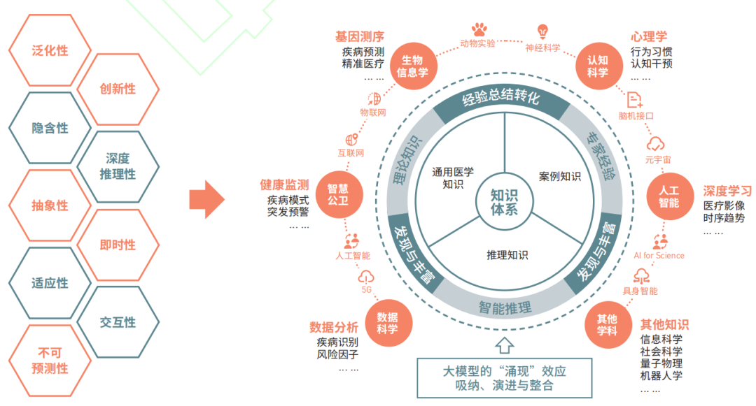 其二,从体系外部来看,大模型“涌现”出的持续学习和自我更新能力确保了知识体系能够不断吸纳外部最新的跨学科研究成果,如将生物信息学、遗传学和人工智能等领域的最新进展整合到医学知识体系中,进一步丰富和完善了健康医疗领域的知识架构。这种跨学科的知识融合为解决复杂的健康医疗问题提供了新的视域和方法。