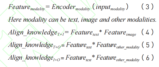 如图3第二行矩形蓝色块所示,该方法的输入分别是患者的电子病历文本inputtext和影像输入inputimage,以及其他模态输入inputother_modality。方法的文本特征提取模块主要是利用预训练好的文本编码器Encodertext,图像特征提取模块是使用预训练好的图像编码器Encoderimage,其他模态使用相应的模态编码器 Encoderother_modality,通过获得文本、图片和其他模态的深层次特征表达,然后使用相似度矩阵乘法的方式实现文本、图像和其他模态的信息对齐。