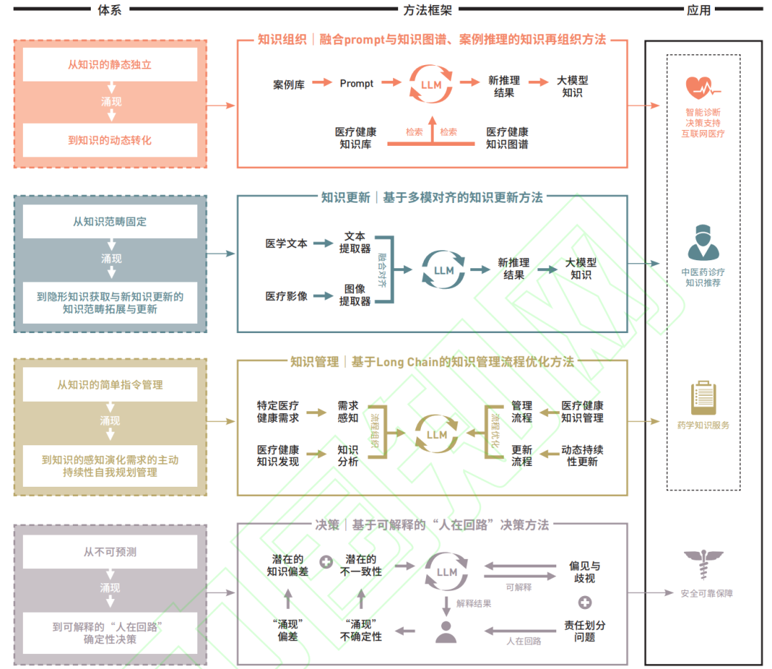 大模型“涌现”出的归纳能力产生出的这部分信息对齐知识是人类以往无法获取到的新知识,它既可以作为模型推理知识以一种简便、快捷的方式为特定的健康医疗问题提供精准可靠的决策知识,又能够通过大模型的自我解释和专家的实践与论证可以精炼成相应的通用知识和案例知识,实现从已知知识到隐性知识获取、知识更新。