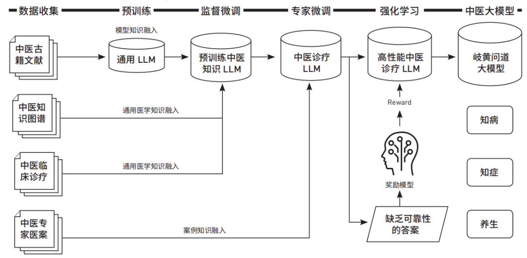 岐黄问道大模型是一款基于已确诊疾病的中医诊疗大模型,它集成在中医临床智能辅助诊疗系统中,实现了从基层村级卫生室到三甲中医院的应用覆盖,积累了400多家等级医院、8,000多家基层医疗机构的用户。主要包括临床诊疗大模型和中医养生调理大模型,它能够基于患者症状、体征信息输出包括中药、经络穴位、食疗、茶饮等一系列多维度养生方案。它收集1,100万条中医知识图谱数据;1,500本中医古籍和文献数据;10万份真实中医专家医案数据;10万条脉象、舌象、经络、穴位数据;200万条真实的中医临床诊疗数据。它主要采用四层递进的训练方式:预训练→监督微调→奖励模型→ 强化学习(如图5所示)。首先,利用千万级的中医知识图谱数据和临床诊疗数据,微调通用预训练模型。最后,由中医专家共同参与,利用奖励模型-强化学习机制,最终形成这一大模型。