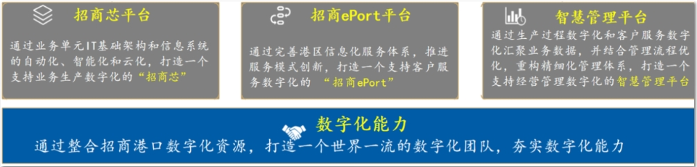 党中央、国务院面向未来准确把握时代大势,于“十三五”期间提出推进数字中国建设,国务院国资委进一步印发《关于加快推进国有企业数字化转型工作的通知》。招商港口及时认真学习有关文件、领悟中央精神,认识到将实体企业和数字化进行融合发展既是坚持深化改革、践行新发展理念的具体举措,也是国企高质量发展的重要引擎、是构建国际竞争新优势的有效途径和构建创新驱动发展格局的有力抓手。