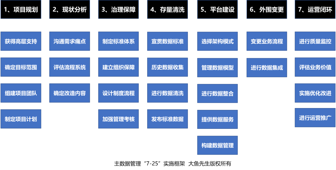 主数据管理实施共分为项目规划、现状分析、治理保障、平台建设、存量清晰、数据集成、外围变更及运营分析七个阶段,涉及25个实施步骤,如下图所示: