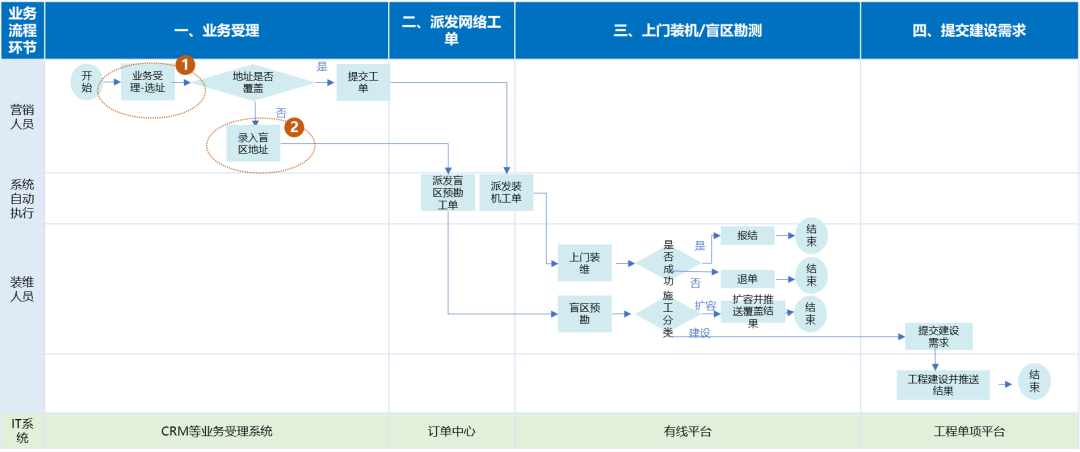 第一、调研业务需求,包括哪些业务需要主数据支撑,对主数据有什么要求和期望,第二、了解业务流程,包括业务如何办理(如填表,工单),如何流转(如是否需要审批),第三、了解业务应用,基于主数据有哪些业务场景。下图显示了家宽业务受理流程中涉及的地址主数据查询和录入情况。