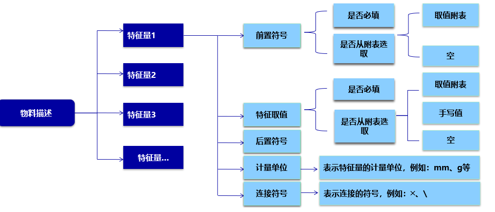 数据标准:主要明确主数据的编码规则、分类标准、命名规范、编码颗粒度、属性规范、主数据模型标准等,下图示例了物料主数据模型和属性描述规则。
