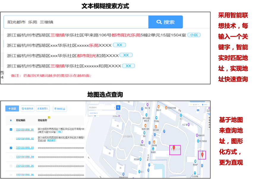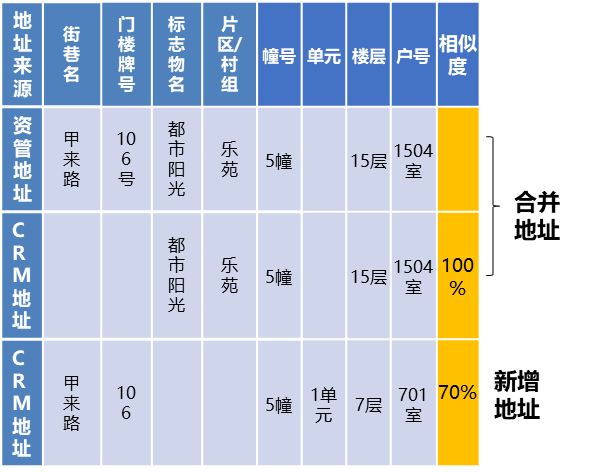 基于主数据标准,对各来源历史数据进行分析,明确数据采集、标准化、内容清洗及合并等方法,比如下图示例了采用空间聚类、地址相似度等方法来实现相同地址合并。