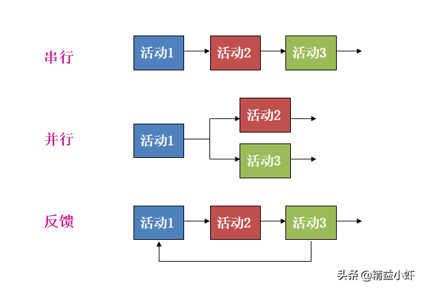 任何流程中都有七个要素,包括:输入、业务规则、各项转化活动、资源、输出、价值、客户。输入与输出:信息:客户需求、订单、指令、文案……物料:原材料、零部件、半成品、产成品……资金:应收帐款、应付帐款、费用支出……无论是信息、物料、资金……等等,既是输入,同样也是输出。转化活动:常见的转化活动类型,包括串行活动、并行活动以及反馈活动。如下图: