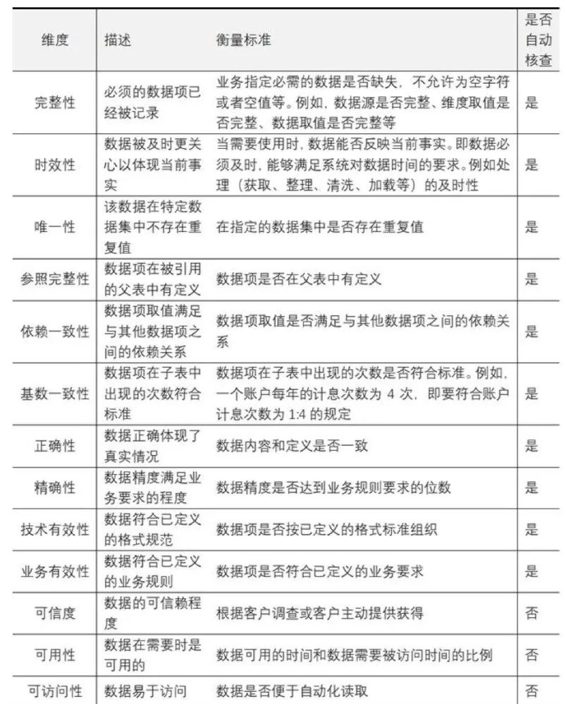 数据标准则又服务于数据质量,我们进行数据治理的目的也是为了提高数据质量,从而提供更为精准的决策分析数据。数据标准的评价维度示例如下: