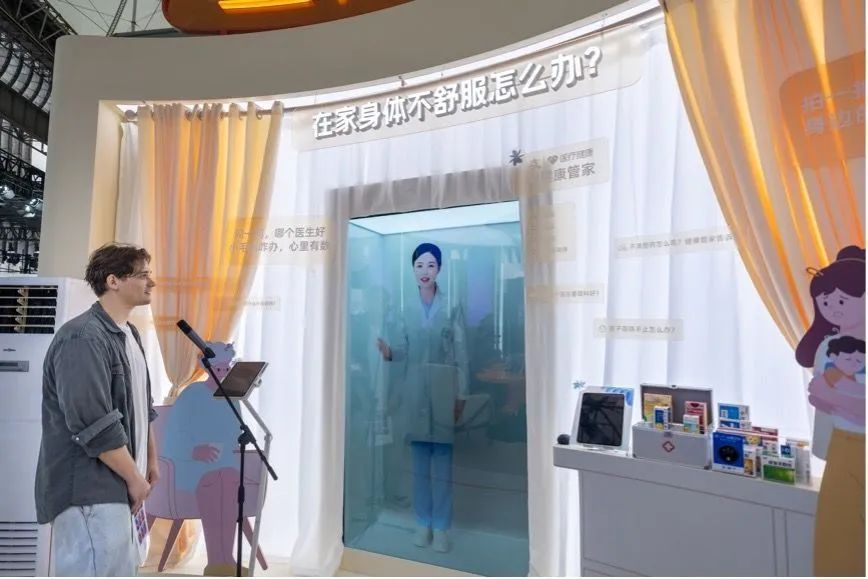 在“未来健康”展区,观众可以体验支付宝AI健康管家提供的AI识药盒、读检查报告等系列家庭健康服务。支付宝医疗健康业务负责人刘婷婷表示,支付宝目前已经推出了医疗大模型,居民可以通过支付宝的入口,向大模型问病问症状、问药问医保。在模拟的医院环境中,还可以看到数字健康人“安诊儿”,“安诊儿”帮助医疗机构为患者提供覆盖就医前、中、后的“AI陪伴就诊”服务。