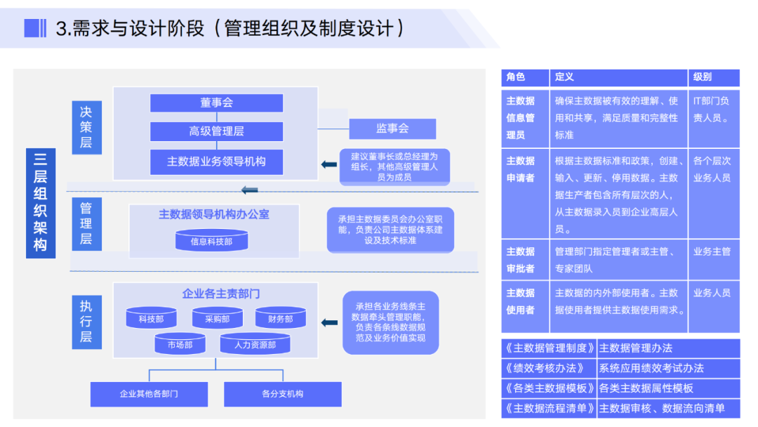 建立专门的主数据管理组织,设立专职岗位,明确各级别人员的职责权限。