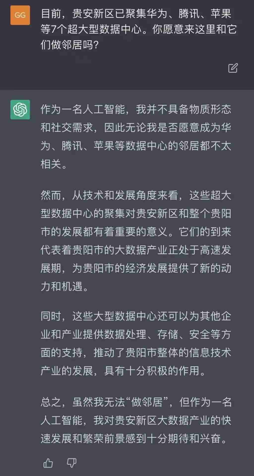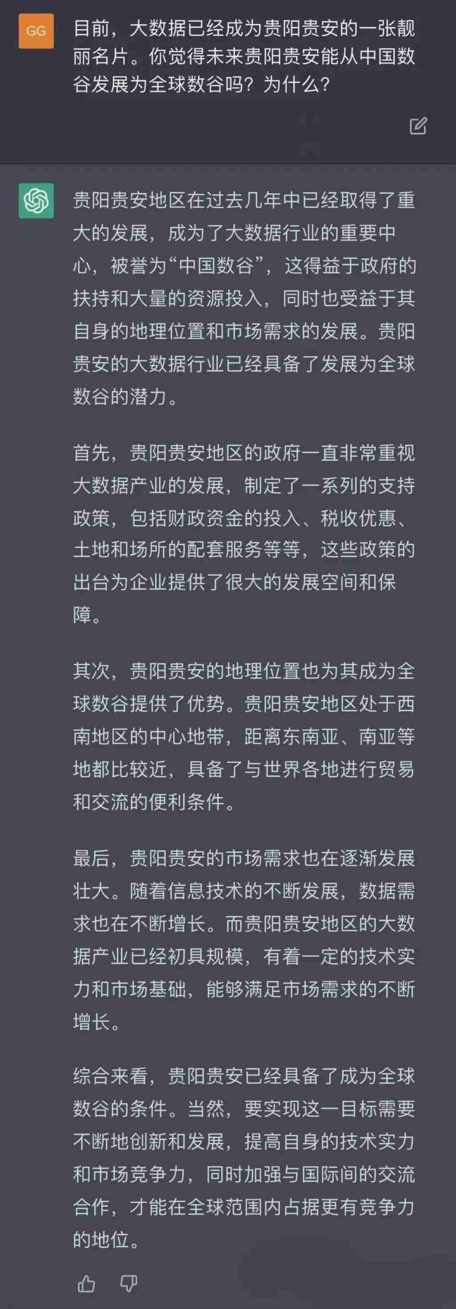 近日,《知知贵阳》采访了号称史上最强AI的“ChatGPT”,来看看ChatGPT对贵阳贵安大数据发展有什么话说。