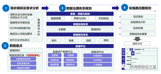 数据治理体系,包括数据战略、数据治理管控体系(数据治理组织、制度、流程、管控机制、绩效体系及标准体系)、数据架构、主数据、元数据、指标数据、时序数据、数据质量、数据安全、数据集成与交换、数据开放和共享、数据资产管理能力成熟度评估以及数据价值、数据共享、数据变现等多方面。