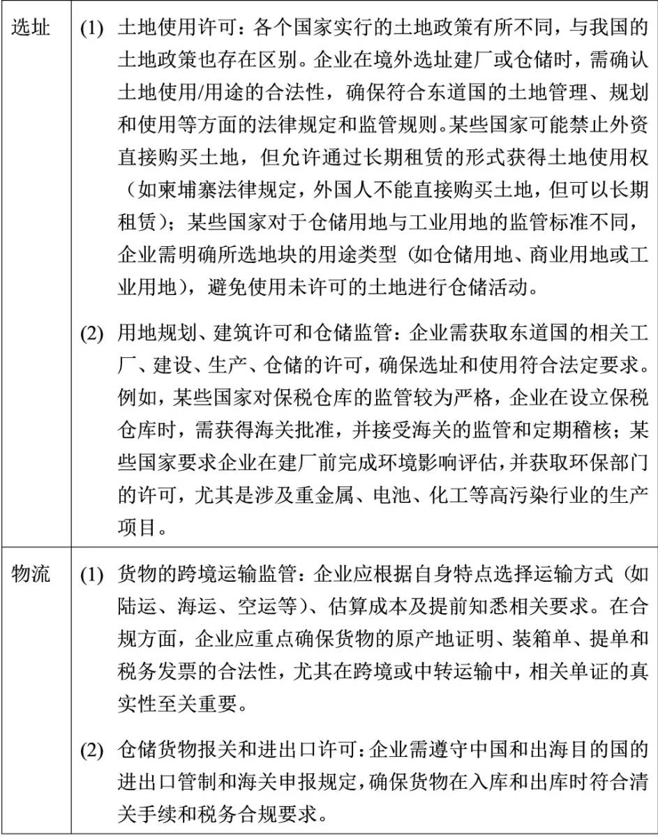 智能制造行业包含生产、仓储、物流、销售等环节,该等相关环节的选址可能直接影响企业的效率和成本。境外选址不仅要考虑企业的地理位置、战略布局和市场需求,还需充分了解当地的法律法规和监管环境,确保运营合法、风险可控,由此,我们于下述简要列示了过程中需重点关注的部分合规要点: