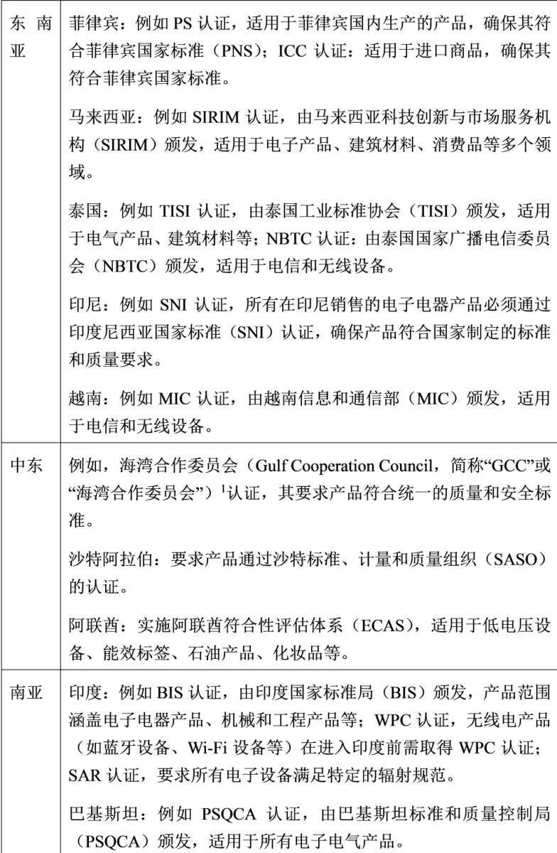 目前,中国制造遍布全球,无论是产业升级较为迫切、基础设施加速建设的东南亚、南亚、中东等区域市场,还是技术需求较高、具有相对标杆效应的欧盟、美国和日本等发达经济市场。产品质量是企业的生命线,产品满足认证标准和法规要求是制造企业的合规重心之一。如下列示了部分国家/地区针对部分产品的主要标准和认证要求: