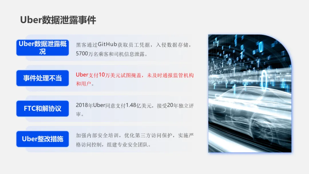 Uber数据泄露事件:当年,Uber涉及5700万名乘客和司机的个人数据被黑客窃取。Uber的安全团队在事发后曾支付10万美元给黑客以掩盖泄露事件,并且未能及时向监管机构和用户披露事件。在这种情况下,美国FTC对Uber展开调查并最终达成和解协议。Uber同意支付1.48亿美元的和解金,并且需要对公司的数据安全措施进行为期20年的独立评审。数字化转型网www.szhzxw.cn