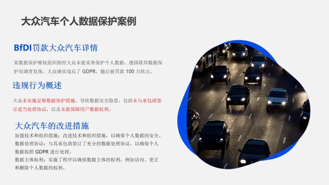 德国联邦数据保护局因大众汽车未实施足够数据保护措施,导致数据安全隐患,包括未与承包商签订适当处理协议,以及未能保障用户数据权利。最终对大众汽车处以100万欧元的罚款。