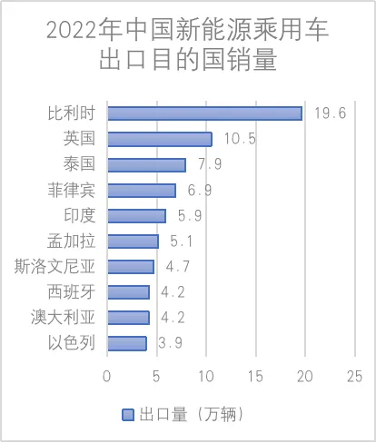目前全球汽车领域正处在由燃油车向新能源车切换的关键节点,我国新能源汽车海外市场渗透率较低,相较于国产燃油车品牌优势不明显的问题,新能源车可作为我国汽车实现出口弯道超越的“主力军”,2022年我国新能源乘用车出口目的国销量情况如图 3 所示。数字化转型网www.szhzxw.cn