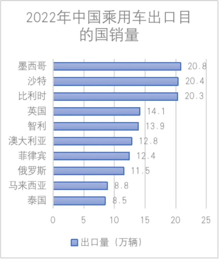 如图 2 所示,中国乘用车主要销往墨西哥、沙特、比利时、英国、智利、澳大利亚、菲律宾、俄罗斯、马来西亚、泰国十国,销售地覆盖各大洲。一方面能够降低单一市场受国际局势动荡冲击较大的局限性,分散经营风险;另一方面能够避免因主攻欧美等高端成熟市场所带来的销量增长缓慢、合规压力巨大的问题,以期快速占领中东、非洲等地区市场份额,提升品牌认知度与消费者接受度。