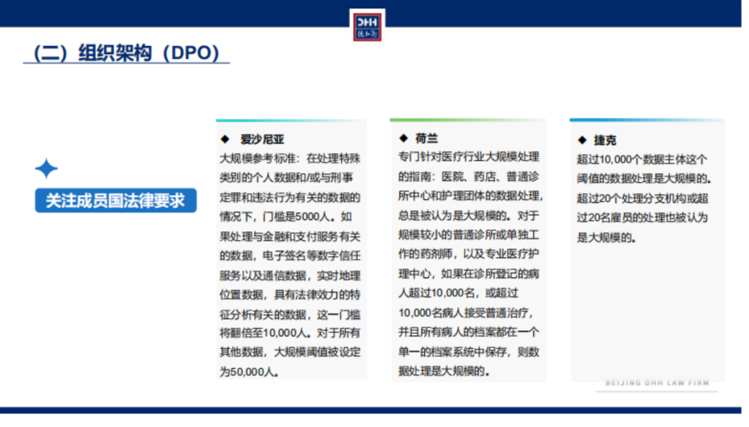 具体来说,“大规模”的判断标准有:有关的数据主体的数量(具体数量或比例);数据量和/或正在处理的不同数据;数据处理活动的持续时间;处理活动的地理范围。“经常性”的判断标准有:持续的或在特定时期内以特定间隔发生的,反复出现或在固定时间内重复出现,或不断地或定期地发生。“系统性”的判断标准有:根据一个系统发生的;预先安排的、有组织的或有方法的;作为数据收集总体计划的一部分而进行的;作为战略的一部分进行的。对于智能汽车,业内公认其属于“系统性”和“经常性”的涵盖范围,所以DPO建设和车企关联度较高。除了关注欧盟GDPR的规定,还应关注欧盟成员国的法律要求,其往往起到加成作用。车企在出海过程中,应充分了解目标国家市场有无特殊规定。