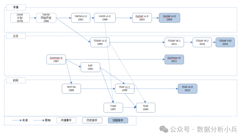 (1)起源于20世纪70年代美国启动的C4ISR计划,这一计划的目标是把美军的战略决策及军队指挥、控制、管理所用的设备、器材、程序关联到一起,形成美军现代军队的神经中枢。在此基础上逐步发展出TOGAF、DODAF相关架构框架。