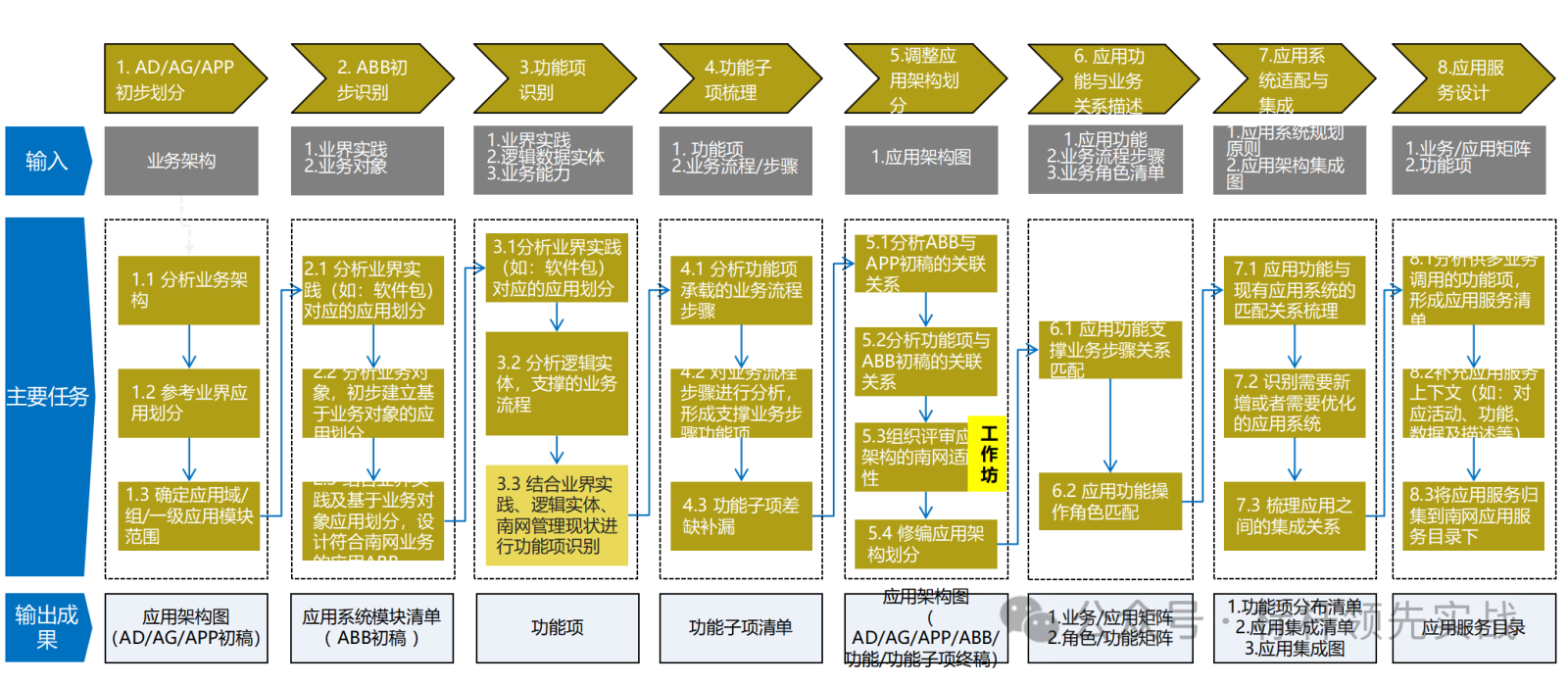 - AD/AG/APP初步划分:根据业务域和业务需求,划分应用域(AD)、应用组(AG)和一级应用系统模块(APP)。