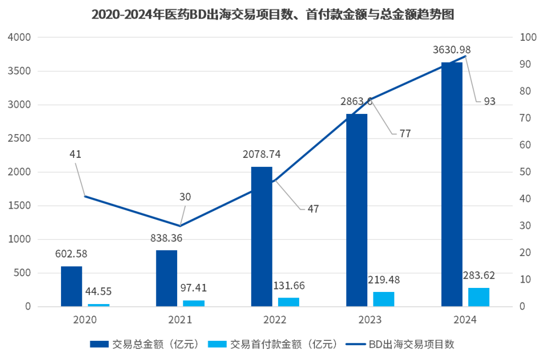 而截至目前,2024年全年医药领域已完成93项出海BD交易,首付款金额达283.62亿元,交易总金额超3500亿元,整体上成功延续了去年“BD交易规模超过IPO融资规模的总体趋势”。
