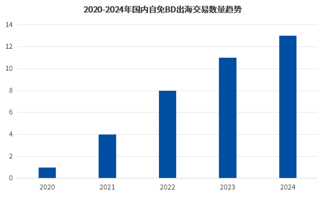 数据显示,2020至2024年国内自免BD出海交易数量逐年增长,2024年共计完成13项相关交易,再创历史新高。