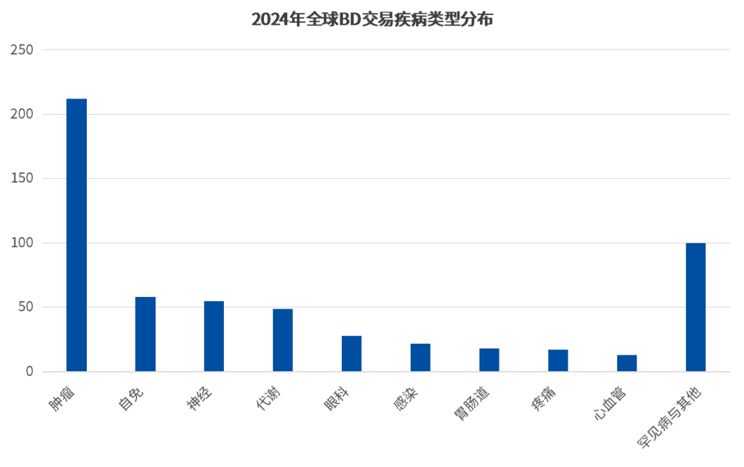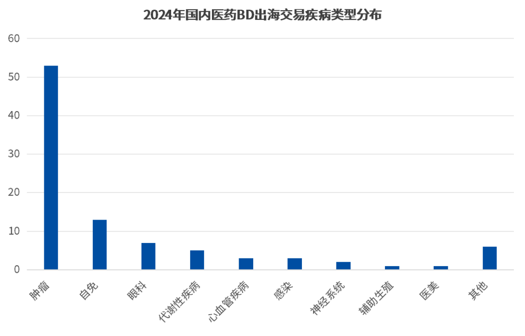在一路走高的BD出海交易中,除了新药技术类型有着较大的变化外,其疾病标的类型也逐渐走向多元化。 以往多年里,BD出海交易的资产大多集中于肿瘤用药,其中缘由较为复杂,但有四点作用较大:
