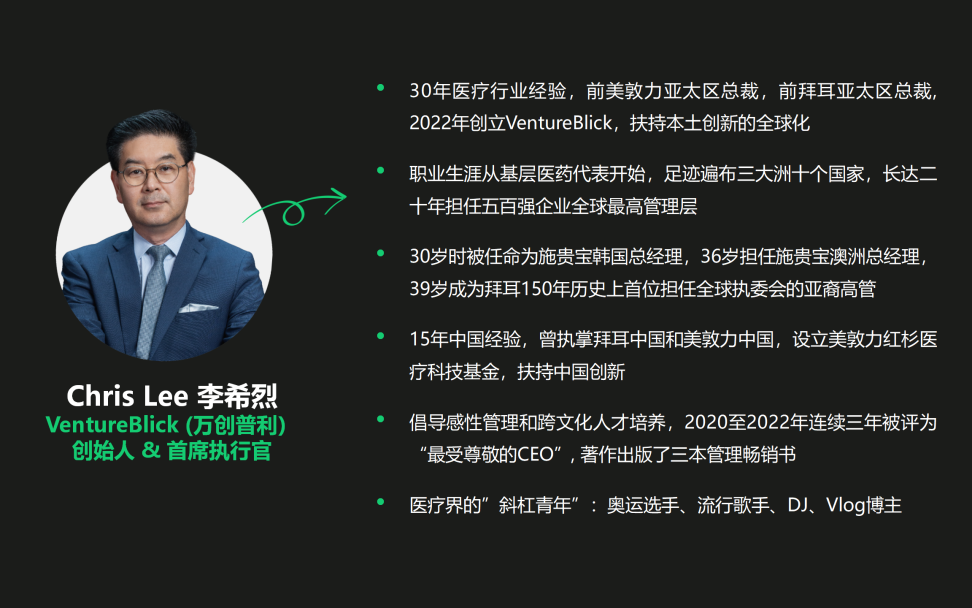 近期,在高榕创投医疗CEO闭门会暨医疗赛道Demo Day上,VentureBlick(万创普利)创始人、CEO,前美敦力亚太区总裁、前拜耳亚太区总裁 Chris Lee(李希烈),以及联合创始人、CMO 蔡云博(Anita Cai),为高榕投资医疗企业分享中企出海普遍遇到的挑战,并给予实战建议。