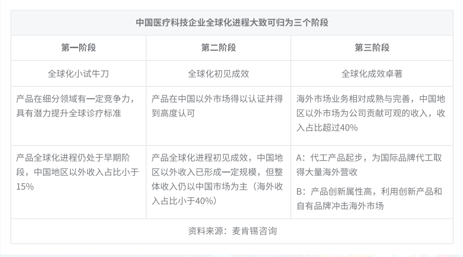 总体而言,中国医疗健康事业已度过摸索探路、积蓄力量的前两大阶段,目前正处于全面参与全球化竞争的新阶段。预判未来将有越来越多的中国医疗健康企业不断提升自身竞争实力,逐渐获得国际市场的认可和支持,最终成功出海。