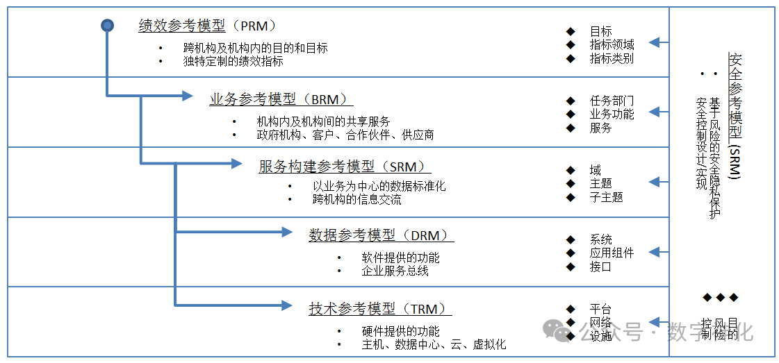 - 更新版本则先考虑“数据参考模型”,然后输出给应用参考模型和技术参考模型,把数据参考模型的梳理提到了前面,进一步强调了数据参考模型的重要性。