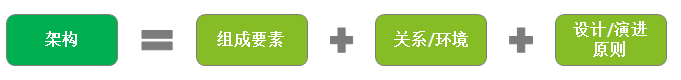 架构的定义:关于“架构”,ISO/IEC 42010:2011给出了定义:一个系统在其环境中的基本概念或属性,体现在其元素、关系及其设计和演化的原则中。架构主要包含3个组成部分,如图1-1所示。