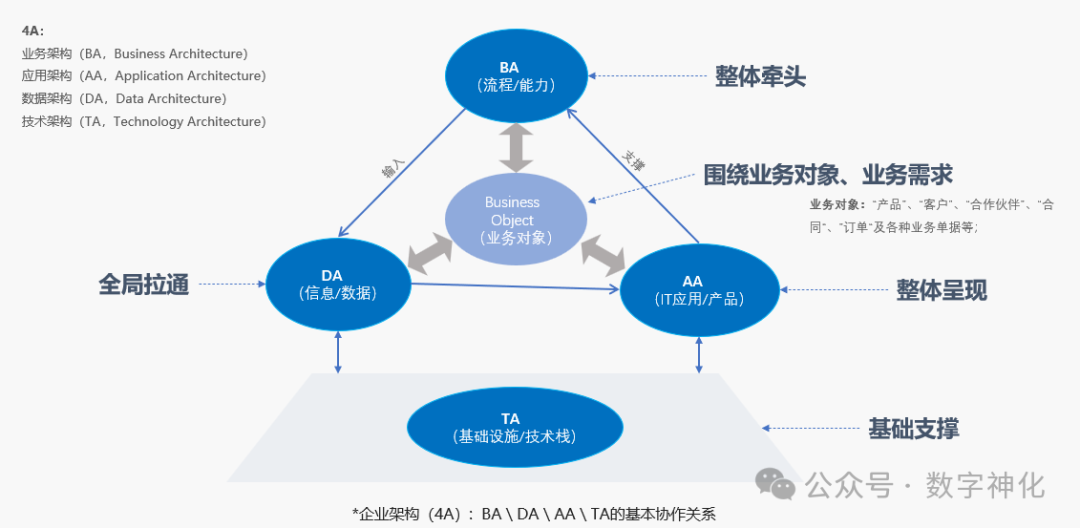 关于4A之间的配合关系,我们可以结合多套理论知识体系及实践感悟,融合输出了业务架构(BA)与数据架构(DA)、应用架构(AA)、技术架构(TA)之间的基本协作关系图,如下图所示。