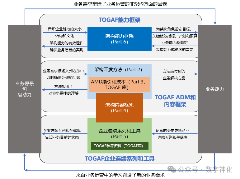 TOGAF体系的6大部分内容及其关系如下图所示。