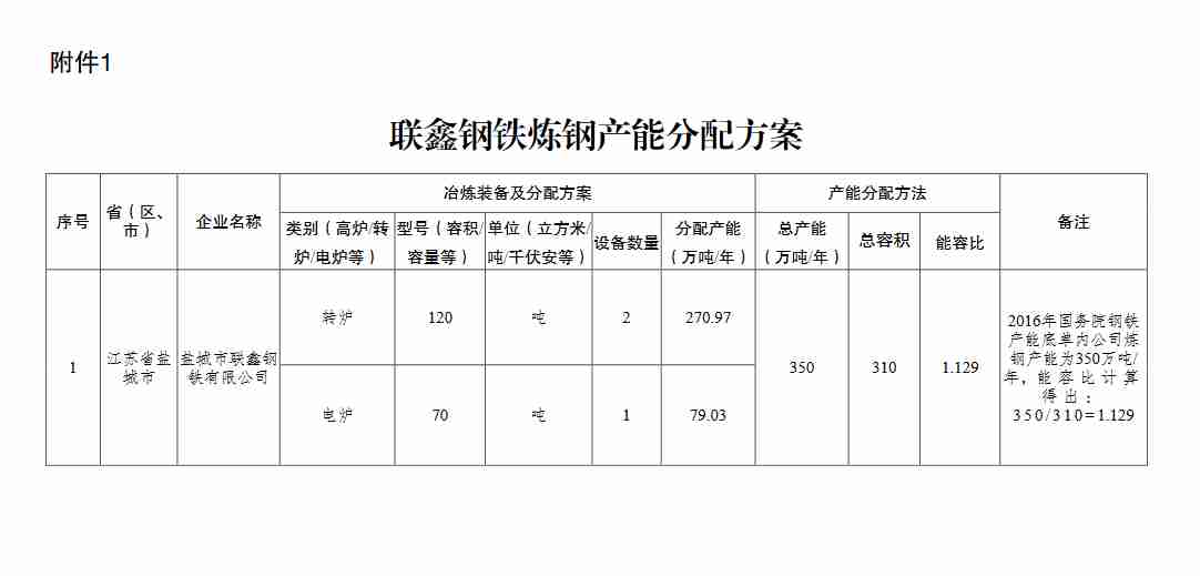 附件:1.联鑫钢铁炼钢产能分配方案