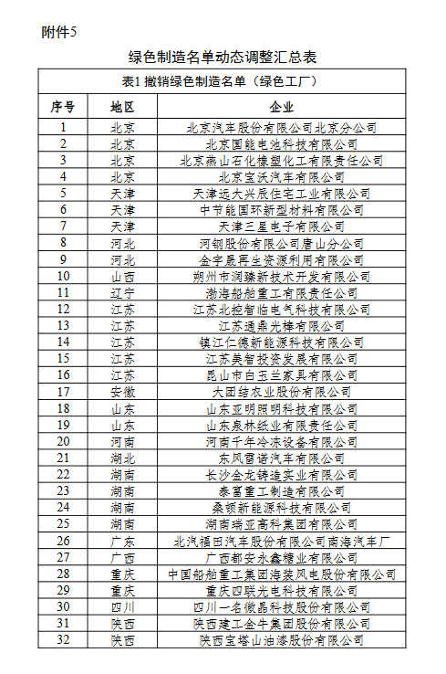二、按照2022年度动态管理要求,经各地工业和信息化主管部门核实确认,我部将前六批绿色制造名单中的41家绿色工厂、72个绿色设计产品、3家绿色工业园区、5家绿色供应链管理企业移出绿色制造名单,104家单位变更名称(见附件5)。